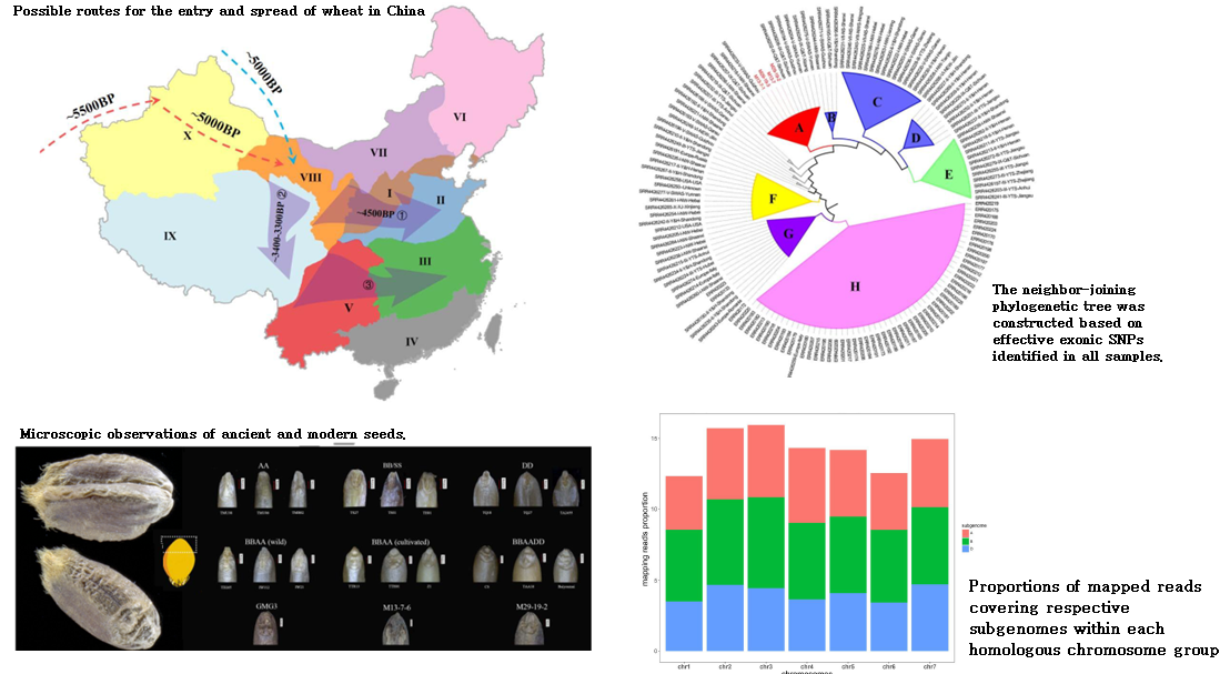 基因组数据分析和形态学观察均证明出土的小麦为六倍体普通小麦;通过与来自中国以及世界各地的现代六倍体小麦品种的RNA-seq数据进行系统发育分析,证明了古代小麦与中国西南地区现存的普通小麦地方品种的密切关系。青藏高原现代地方品种与古代小麦高度相似的等位基因频率为小麦向高原传播的西南途径提供了更加直接以及有力的分子依据,同时本研究也提出了普通小麦从青藏高原边缘到长江流域的扩散路线。此外,该研究结果为中国种植的现存小麦地方品种的栽培起源,扩散和遗传改良提供了重要信息。