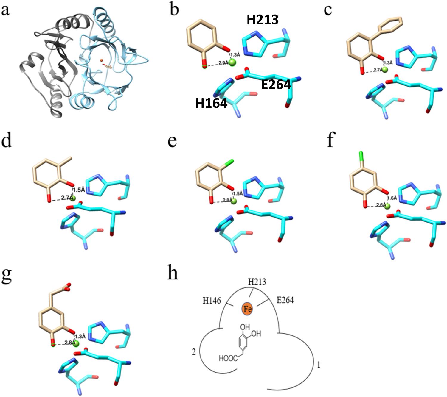 高仁钧教授团队从嗜热微生物弯曲热单孢菌中筛选得到高活性的外二醇双加氧酶Tcu3516,并对其酶学性质进行了表征。通过对Tcu3516序列相似性分析,发现其属于邻氧螯合家族(VOC)/Ⅰ型,且该酶与已报道的其他双加氧酶的序列一致度仅为25-44 %。经过系统发育树分析进一步证明,该酶属于独特分支的、尚未被研究的双加氧酶。酶学性质表征表明,该酶最适温度为50 ℃,最适pH为9.0。且在55 ℃时,该酶仍具有良好的热稳定性。Tcu3516具有广泛的底物适应性,对多种天然底物,包括儿茶酚、3-甲基儿茶酚、3-氯儿茶酚、4-氯儿茶酚、2,3-二羟基邻苯二酚和3,4-二羟基苯基乙酸均有催化能力,特别适合用于环境污染物的清除。通过对Tcu3516进行同源建模,并与底物分子对接(图1),动力学模拟了解该酶与底物的作用方式。并在此基础上,通过半理性设计对其催化口袋末端的环结构进行改造,获得性能良好的突变体。