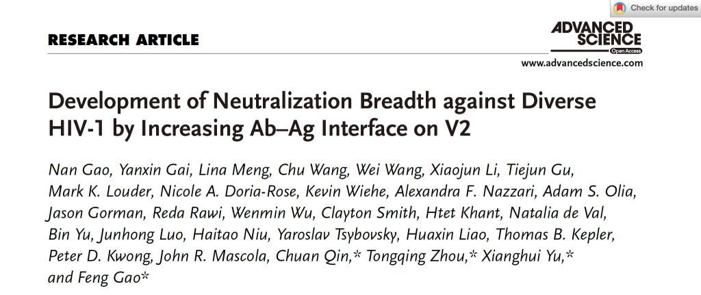 高峰教授、于湘晖教授科研团队针对目前已知报道感染时间最长的恒河猴动物模型作为研究对象,分析其体内诱导产生的广谱中和活性。通过抗体分离获得针对特异表位的J038广谱中和抗体谱系。该工作研究抗体谱系以及体内病毒包膜蛋白的突变情况,追溯广谱中和抗体的进化过程以及与SHIV共同进化的过程,分析非人类灵长动物体内与人体内产生广谱中和抗体的类似性,为更好地应用恒河猴模型来评价HIV-1疫苗提供理论和实验依据。该J038谱系抗体的发育细节和识别特征为今后V2靶向广谱中和抗体的研究和应用提供了新的见解。该研究成果于2022年03月24日在学术期刊《Advanced Science》在线发表(Development of Neutralization Breadth against Diverse HIV-1 by Increasing Ab–Ag Interface on V2)。论文第一完成单位为葫芦娃视频