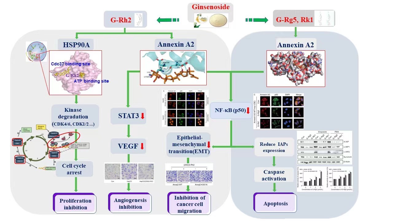 金英花教授科研团队暨2017年首次报道人参皂苷Rh2的人类靶点的研究之后,又取得了一系列新进展:1)HSP90蛋白是肝癌、膀胱癌、食管癌和肺癌等多种癌症中高表达并与患者不良预后正相关的癌症标志物蛋白质。其作为分子伴侣,介导癌细胞中大量存在的突变蛋白质的折叠与稳定,进而助力癌细胞的生存、生长与转移。金英花教授科研团队在前期利用噬菌体展示技术的人参皂苷人类靶点筛选工作中惊喜地发现Hsp90A是人参皂苷Rh2的潜在靶点蛋白质,通过分子对接计算与蛋白质热漂移分析证明了人参皂苷Rh2可同时结合Hsp90A氨基段的ATP结合位点和MC段CDC37结合结构域,高效抑制Hsp90A的分子伴侣活性。进一步证明了人参皂苷Rh2对Hsp90A的靶向抑制,引发细胞周期的关键调控激酶CDK4/CDK6, CDK1和CDK2的蛋白酶体降解,进而抑制Rb蛋白质的磷酸化和细胞周期G0/G1期阻滞。众所周知,Rb通路的变异是细胞癌变的必要条件,因此人参皂苷对Rb通路的有效抑制不仅有利于肝癌、膀胱癌、食管癌和肺癌等Hsp90A高表达的癌症的治疗,同时提示其对肿瘤的普遍防治作用(第一作者陈晨,Int. J. Mol. Sci.);2)阐明了人参皂苷Rg5和Rk1通过靶向抑制膜联蛋白A2抑制NF-kappa B的转录活性,进而抑制肿瘤细胞的抗药性(第一作者王宇石,Protein Cell);3)证明了人参皂苷G-Rh2通过靶向抑制Annexin A2-STAT3-VEGF途径,抑制肿瘤细胞的促血管生成作用(第一作者王宇石,Int. J. Mol. Sci.);4)通过靶向抑制Annexin A2-NF-kappa B途径抑制肿瘤细胞的转移(第一作者王宇石,Biomolecules)。NF-kappa B和STAT3是肿瘤微环境的形成和维持过程中发挥关键作用的转录因子,稀有人参皂苷对这些转录因子的抑制作用强烈提示:作为天然化合物,人参皂苷可通过靶向多种肿瘤关键调控蛋白质和信号转导通路,有效防止肿瘤的发生、发展和转移。以上研究得到了吉林省科技厅、吉林省省校共建计划专项项目的支持。