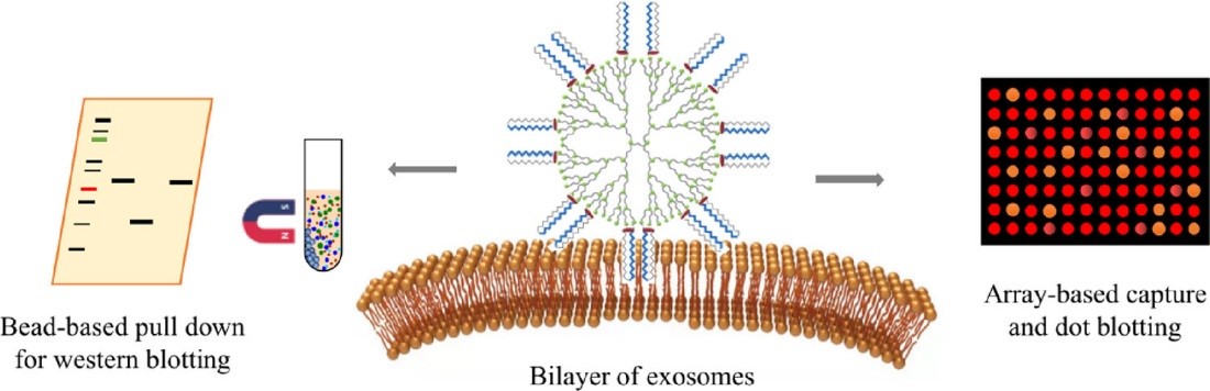 外泌体是一种细胞分泌的囊泡状结构小体,广泛存在于血浆、尿液等各种体液中,外泌体蛋白质组成及其翻译后修饰与疾病的发生发展有着密切的联系。由于受到磷脂双分子层膜的保护,外泌体中蛋白质的修饰形态更为稳定,因此能够更精确反应机体的生理和病理状态,是疾病标志物筛选的理想来源。由于外泌体在复杂生物样本中的丰度较低,现有的外泌体的分离方法不能满足于大量临床样本分析的需求,基于此,胡良海教授课题组发展了一种两亲性超分子探针,该探针通过与外泌体双分子层膜之间的多价相互作用形成超分子复合物,从而实现了微量临床样本中外泌体的高效捕获。