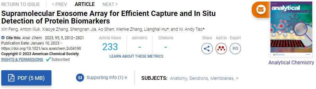 胡良海教授与普渡大学癌症研究中心陶纬国教授合作,开发了一种高通量阵列探针用于外泌体高效捕获和蛋白标志物的原位检测。2023年2月7日以题为“Supramolecular Exosome Array for Efficient Capture and In Situ Detection of Protein Biomarkers”的封面文章发表于ACS出版社的Analytical Chemistry。