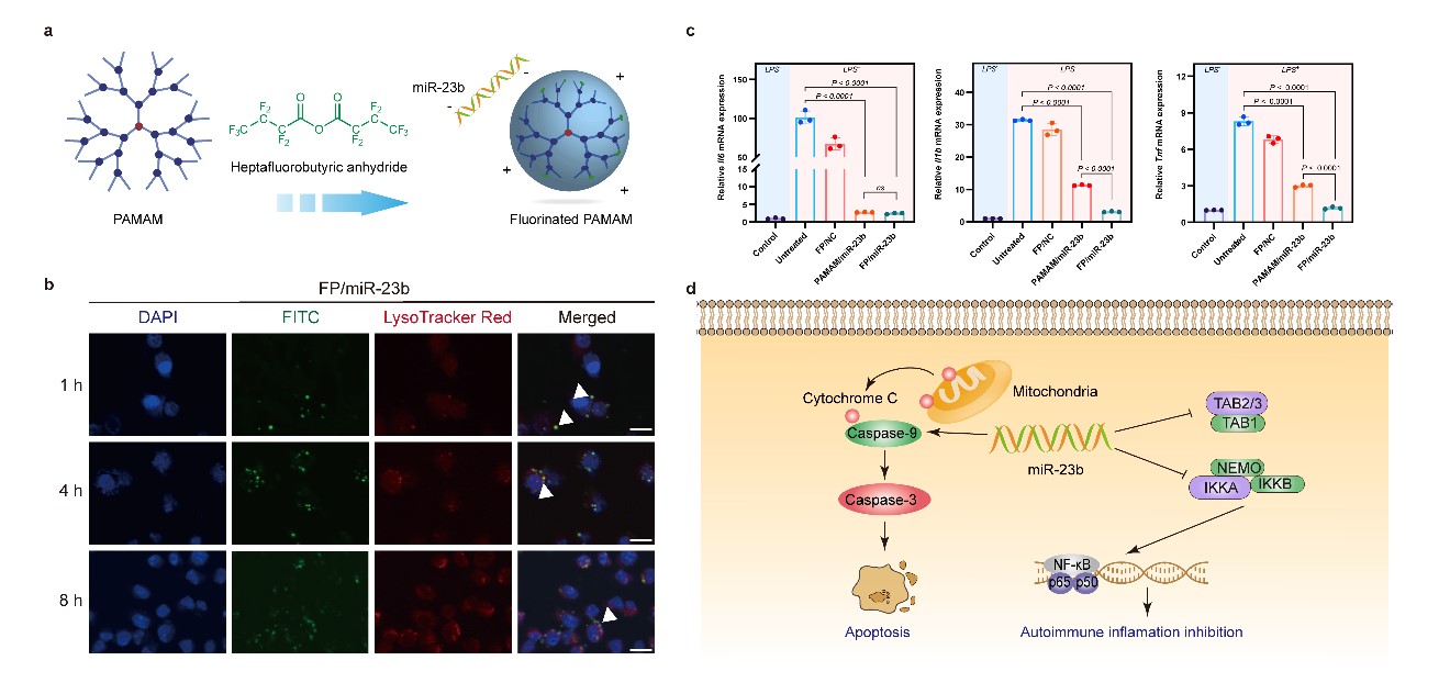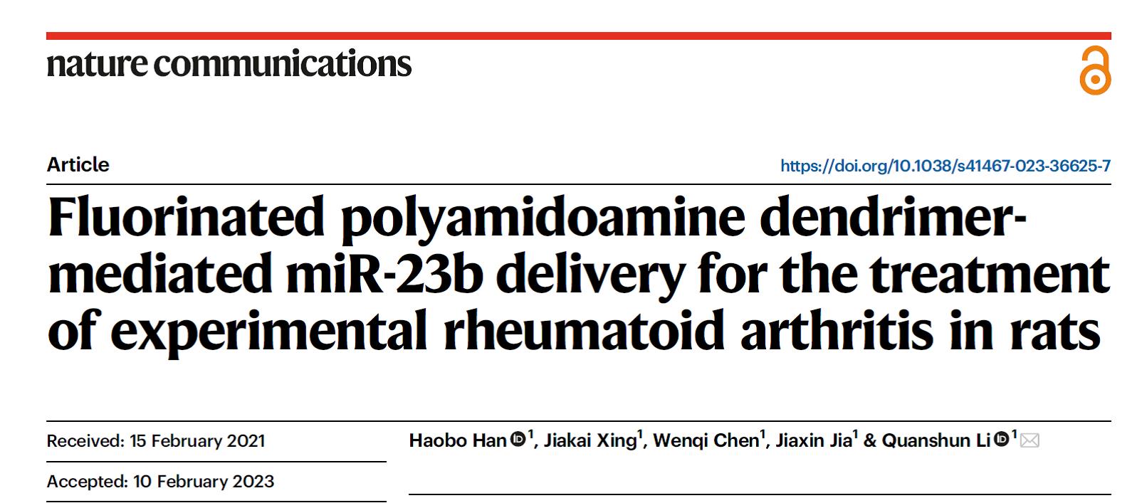分子酶学工程教育部重点实验室李全顺教授团队,针对类风湿性关节炎的关键信号分子miR-23b,构建氟化修饰型树枝状高分子作为基因递送载体,实现miR-23b在关节炎动物模型中的稳定递送,取得了良好的治疗效果;同时,研究揭示了miR-23b能够抑制TAB2、TAB3以及IKK-α表达,阻断NF-κB炎症信号通路,并诱导巨噬细胞凋亡,实现体内抗炎功能。研究结果以Fluorinated polyamidoamine dendrimer-mediated miR-23b delivery for the treatment of experimental rheumatoid arthritis in rats为题,于2023年2月20日在学术期刊《Nature Communications》正式发表。论文第一完成单位为葫芦娃视频