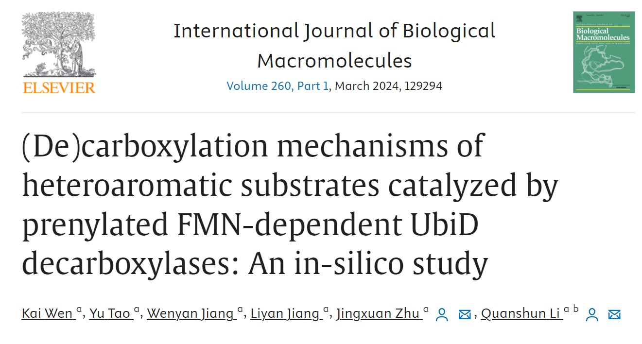 分子酶学工程教育部重点实验室李全顺教授团队立足于国家双碳战略,基于计算机辅助策略,系统探究“碳”高值转化酶UbiD脱羧酶催化杂环底物脱羧/羧化反应的理论机制。以UbiD可逆脱羧酶催化CO2固定,同时能够实现高价值羧化产物杂芳族羧酸的生产,在医学、农业和化工行业中具有极高的应用价值。本研究中,以计算模拟策略为工具,确定了羧化反应中的质子转移步骤是整个可逆脱羧/羧化反应的限速步骤,为采用“稳定过渡态”策略进行UbiD酶的分子改造与设计提供理论支撑。相关研究“(De)carboxylation mechanisms of heteroaromatic substrates catalyzed by prenylated FMN-dependent UbiD decarboxylases: An in-silico study”发表于国际学术期刊International Journal of Biological Macromolecules。论文第一完成单位为葫芦娃视频