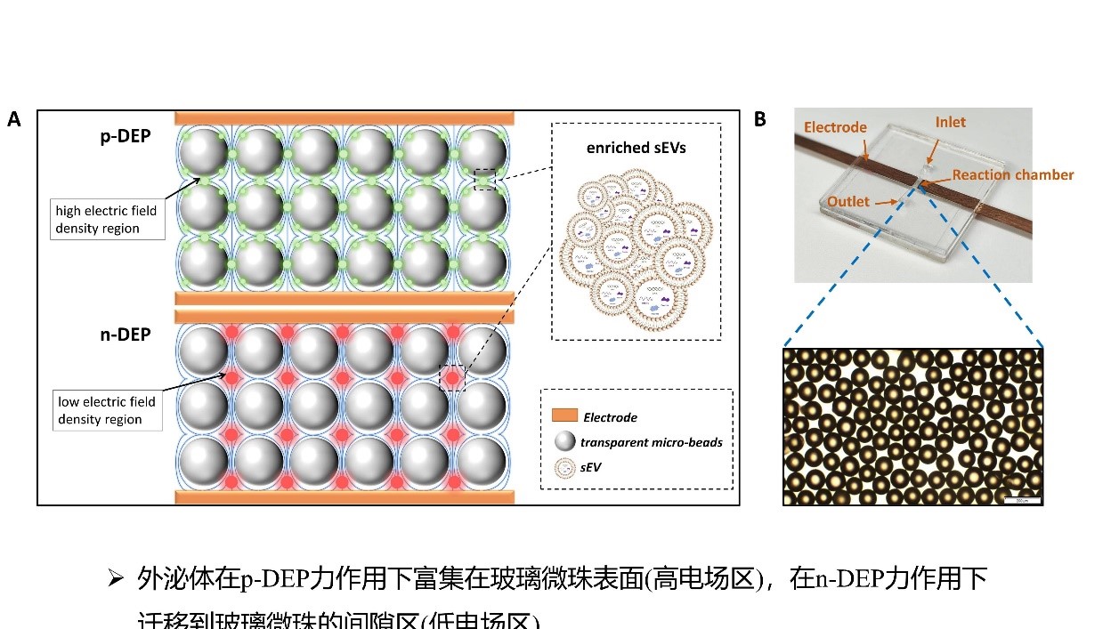 (A)acDEP-Exo芯片捕获sEV的原理示意图。(B)芯片反应腔中填充透明微珠的实物图。