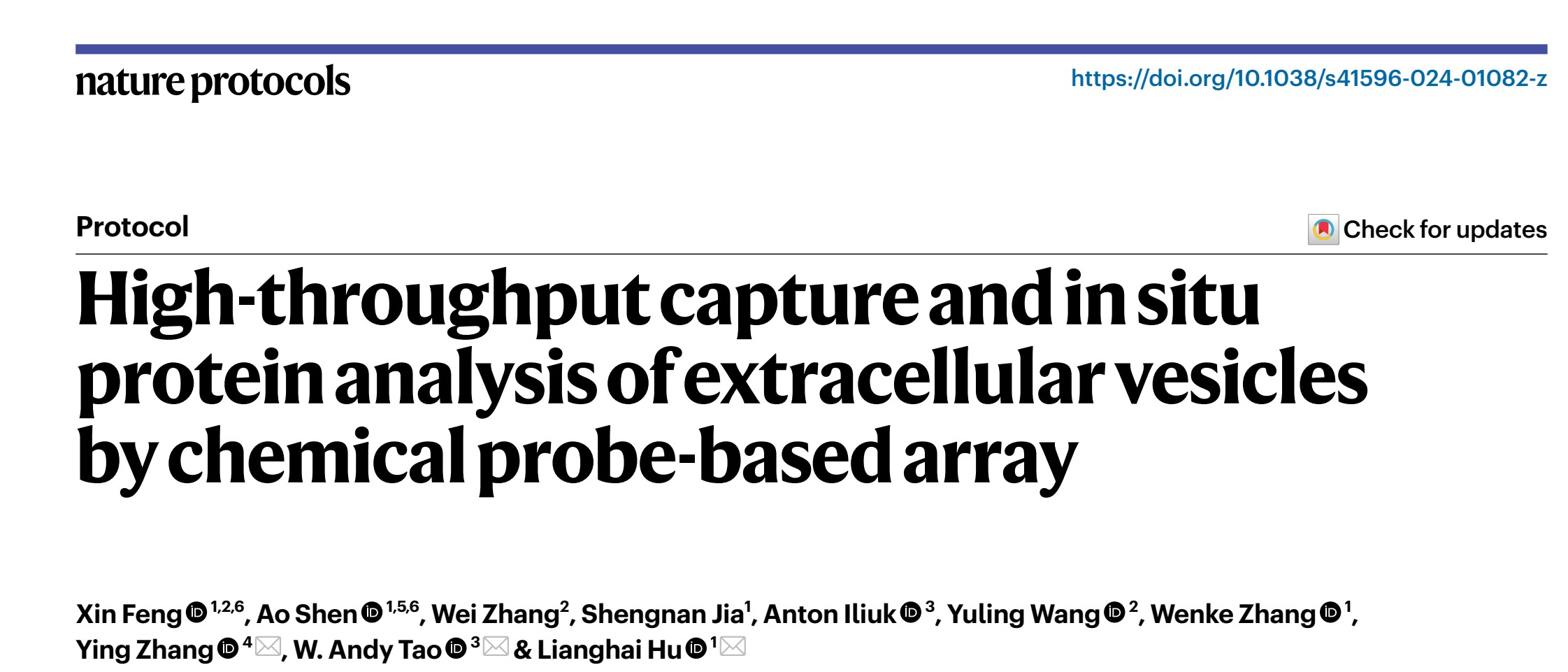 胡良海教授联合美国普渡大学陶纬国教授和复旦大学张莹教授,开发了外泌体高通量捕获和原位蛋白质分析的一体化平台,以题为High-throughput capture and in situ protein analysis of extracellular vesicles by chemical probe-based array在线发表在Nature Protocols上。