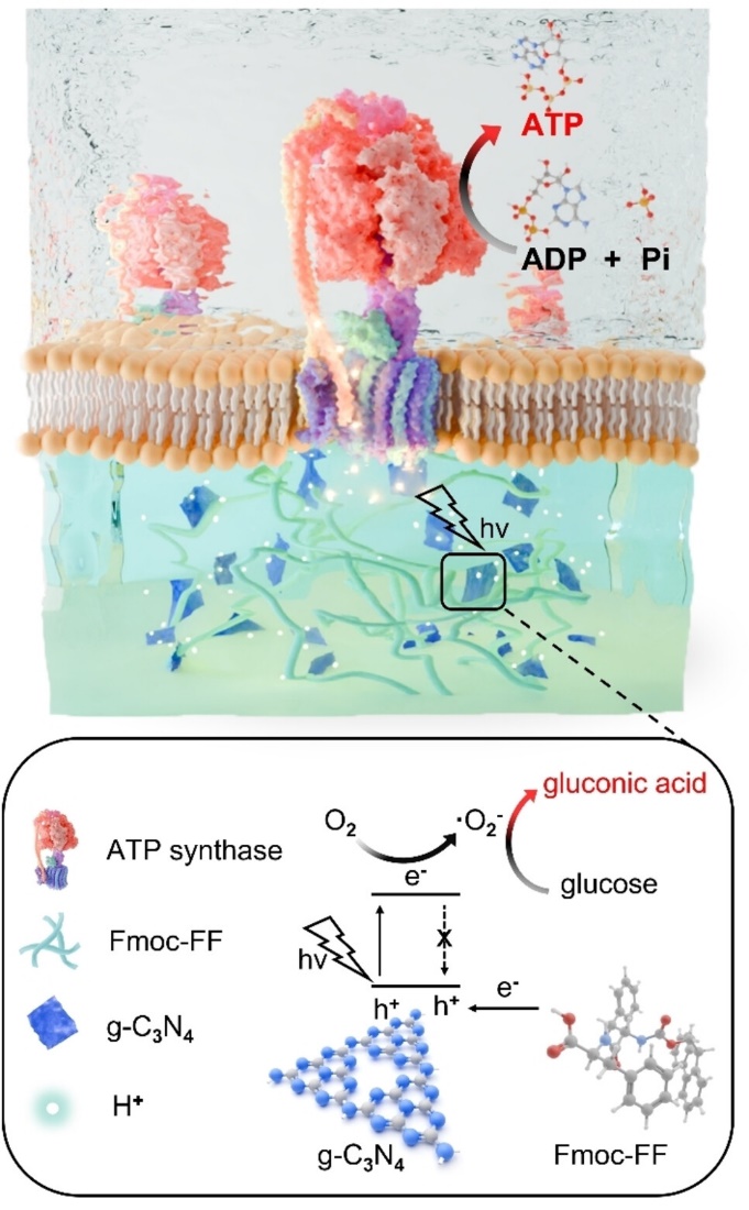 李悦/李自博课题组构筑了一种二肽水凝胶支撑的ATP合酶组装体系,通过预先包埋g-C3N4纳米片于Fmoc-FF水凝胶,利用二者协同的电子耦合效应,在水凝胶内外构造光控的质子梯度,用于驱动ATP合酶催化生成ATP(图 1)。极细的纳米纤维为g-C3N4超薄纳米片提供了良好的分散位置,有效提升了体外光合磷酸化效率,拓宽了二肽水凝胶在仿生器件领域的实际应用。相关研究”A well-coupled supramolecular system accelerates photophosphorylation”发表于国际学术期刊Angewandte Chemie International Edition(2025,e202417474)。此项研究工作得到了国家自然科学基金重大项目、国家自然科学基金青年项目、科技部重点研发计划的支持。论文第一完成单位为葫芦娃视频