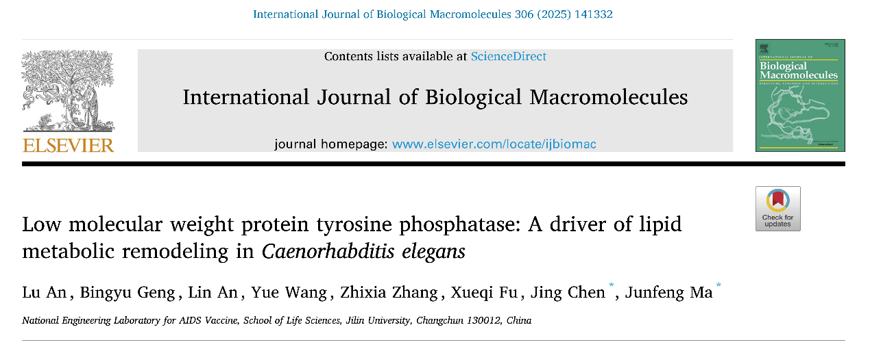 该成果以《Low molecular weight protein tyrosine phosphatase: A driver of lipid metabolic remodeling in Caenorhabditis elegans》为题,发表于国际学术期刊International Journal of Biological Macromolecules。此项研究工作得到了国家自然科学基金、国家重点研发计划以及吉林省科技发展项目的支持。论文的完成单位为葫芦娃视频