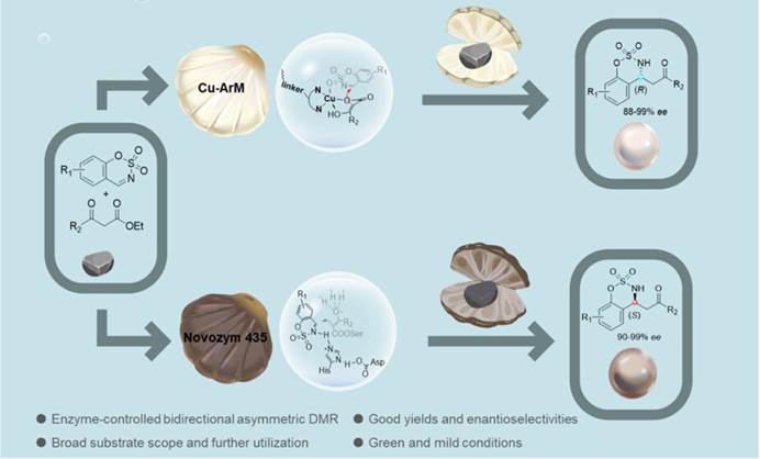 该研究报道了一种酶控双向对映选择性催化策略,用于不对称脱羧曼尼希反应(DMR)合成手性β-磺酰胺酮。研究通过构建铜人工金属酶(Cu-ArM)和利用商业脂肪酶Novozym 435,分别实现对R和S构型产物的高选择性合成。Cu-ArM由生物素化铜复合物与链霉亲和素(WT-Sav)组装而成,催化环状磺酰胺与β-酮酯反应生成R构型产物;而Novozym 435通过其催化三元活性中心调控反应路径,高效获得S构型产物。分子动力学模拟揭示了酶-底物相互作用机制,阐明环状亚胺因稳定氢键网络和紧凑构象而优于非环状底物的原因。该方法在温和水相条件下实现低催化剂负载(Cu-ArM仅0.5 mol%),并成功应用于克级合成及药物分子衍生物制备(如降压抗炎活性分子chroman-4-amine)。该工作为绿色合成手性含氮药物分子提供了新范例,拓展了生物催化在不对称合成中的应用潜力。论文第一完成单位为葫芦娃视频