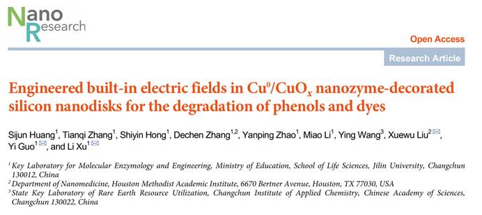 此外,徐力、郭轶教授团队以多孔硅盘(DPS)作为载体,通过化学还原负载Cu纳米粒子,成功合成了一种具有类漆酶活性的Cu@DPS纳米酶。与天然漆酶相比,Cu@DPS纳米酶表现出更好的底物亲和力和更高的稳定性,可用于酚类污染物和染料的催化降解。DFT计算表明,Cu@DPS中异质界面形成的内键电场在维持纳米酶表面Cu的价态和氧空位的数量方面起着关键作用,从而保证了Cu@DPS纳米酶的持续催化性能。该研究表明,纳米酶的类酶活性不仅仅受到表面状态影响,在特定情况下其内部结构同样能够影响其催化性能,这可以为高效纳米酶的设计提供了新的思路和方法。研究论文“Engineered built-in electric fields in Cu0/CuOx nanozyme-decorated silicon nanodisks for the degradation of phenols and dyes”发表在国际学术期刊《Nano Research》上。论文第一完成单位为葫芦娃视频