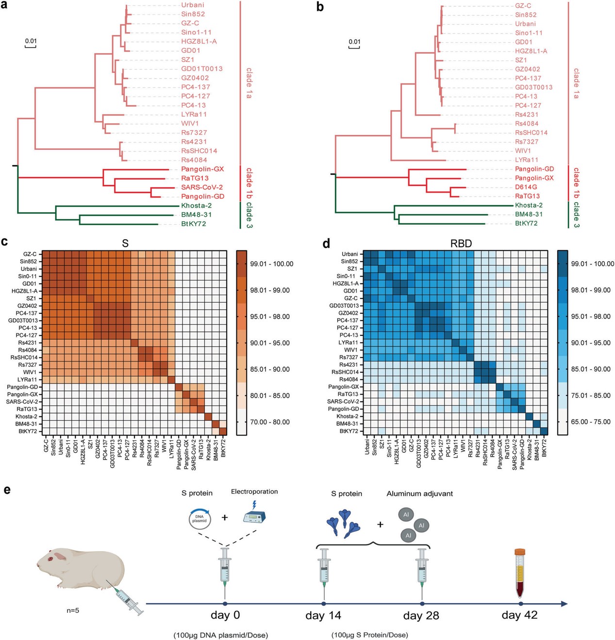 研究以多种具有代表性的沙贝病毒为研究对象(图1),通过假病毒中和实验系统评估不同病毒刺突蛋白诱导抗体的交叉中和能力,首次从免疫学功能关系角度对病毒进行整体比较。研究结果显示,病毒之间的免疫学相似性与传统系统发育关系并不完全一致,部分遗传距离较远的病毒仍可表现出显著的交叉中和反应,提示基于序列保守性或系统发育距离的抗原选择策略存在局限(图2)。通过对中和反应谱的系统分析,研究揭示了沙贝病毒之间潜在的免疫学分群特征,并据此提出最小化免疫原组合策略,为兼顾免疫广度与免疫聚焦的疫苗设计提供了实验依据。