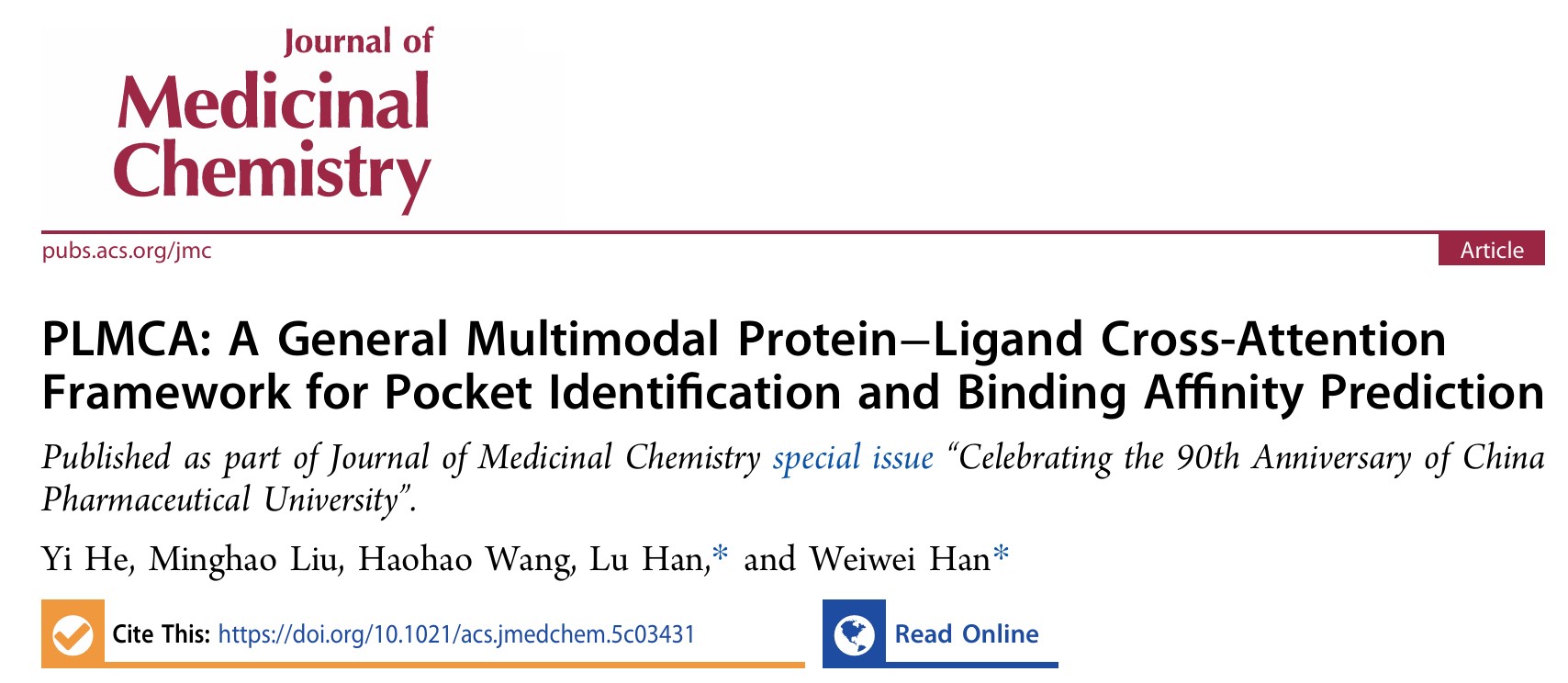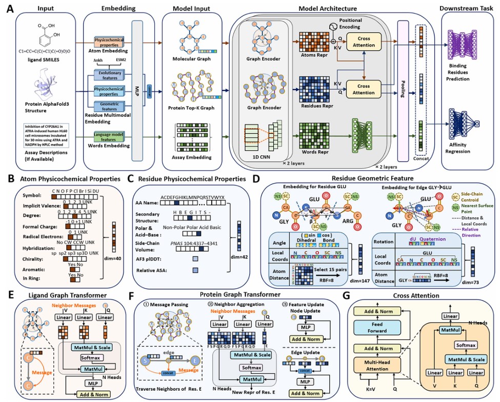 分子酶学工程教育部重点实验室韩葳葳教授、韩璐教授研究团队在基于AI的蛋白-配体相互作用研究方面取得重要进展。该研究围绕药物-靶标结合位点和结合亲和力预测的核心难题,构建了多模态蛋白-配体交叉注意力框架,系统整合蛋白序列表示、三维结构特征与配体分子图信息,并引入实验条件信息以提升模型的稳定性与泛化能力。研究进一步实现了结合亲和力预测与蛋白结合口袋识别的统一建模,为虚拟筛选与理性药物设计提供了新的技术路径和理论支撑。研究成果于2026年2月12日在国际学术期刊《Journal of Medicinal Chemistry》上发表。