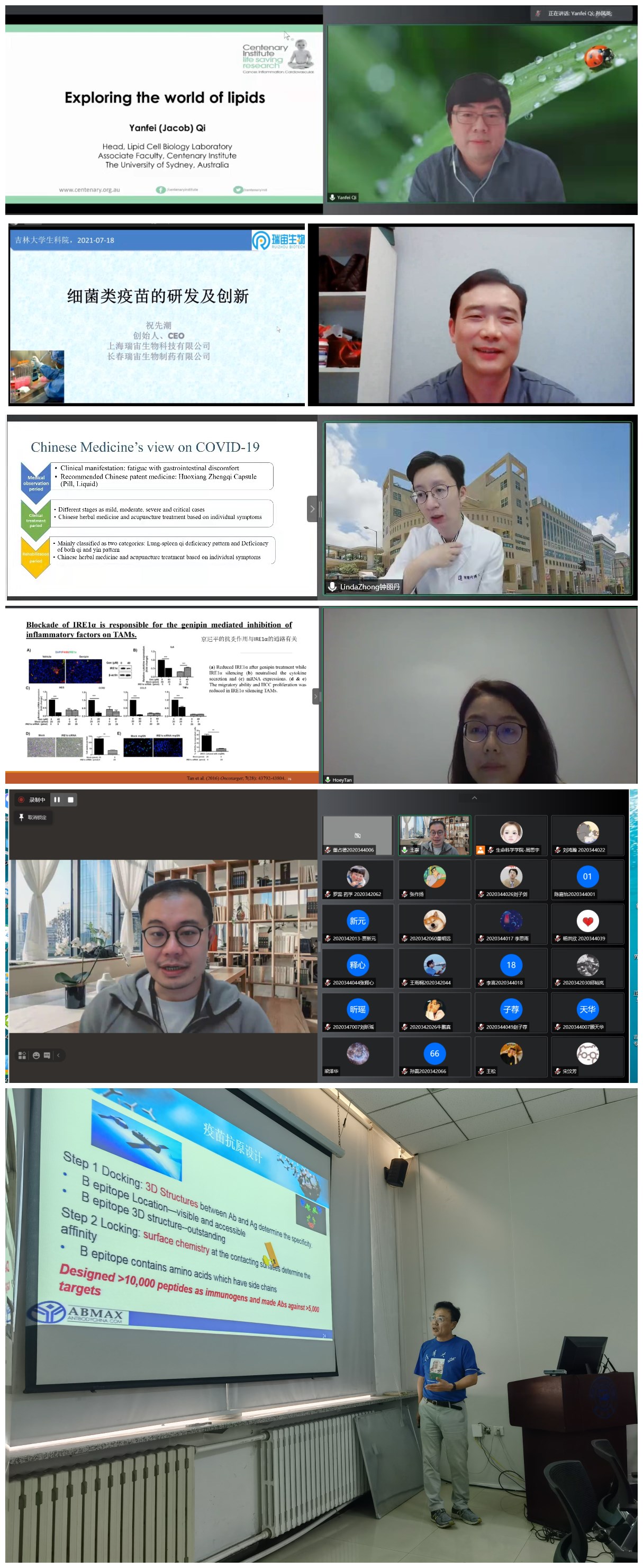 “系列讲座”面向国际学术前沿,围绕生命科学领域重点科学问题,旨在提升学生科研创新能力和国际对话水平,并加强学院国际学术交流与合作。讲座嘉宾既有来自高校的杰出学者(香港大学王宁博士、香港浸会大学钟丽丹博士、Tan Hor-Yue博士、悉尼大学齐延飞博士),也有来自企业界的生物学专家(瑞宙生物科技有限公司创始人祝天潮博士、京天成生物技术有限公司总裁孙乐博士)。讲座迄今已举办6场,内容包括“肝病和肝癌中髓源抑制性细胞的调控研究”、“中医药治疗新冠肺炎的智慧”、“巨噬细胞在肿瘤微环境中的调节作用”、“脂质世界的探索”、“细菌类疫苗的研发和创新”、“新冠病毒突变与疫苗研发”。