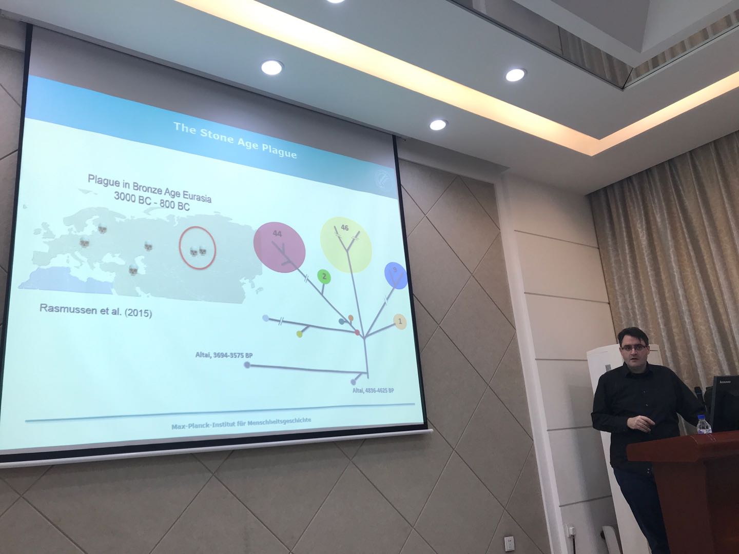 报告的名称为:鼠疫耶尔森菌基因组的进化(Genomic Evolution of Yersinia pestis),报告内容涵盖目前古DNA研究的最新技术、目标序列的捕获富集、系统发育树的构建等领域,同时,Herbig博士用简洁易懂的语言向听众展示了DNA序列比对、SNP位点获取、质量控制等生物信息学技术的基本原理与大致流程,根据不同时代、不同地域的系统发育树推断了鼠疫耶尔森菌在亚欧大陆的传播历史,展示了该致病菌的几个古老祖先。最后,Herbig博士还向大家展示了鼠疫耶尔森菌的线粒体基因组致病因素的heatmap图,并根据不同种类的古菌基因座的比对推测鼠疫传播方式和途径。讲座过后,不少师生就报告内容向Herbig博士提出疑问,Herbig博士一一作出了解答。
