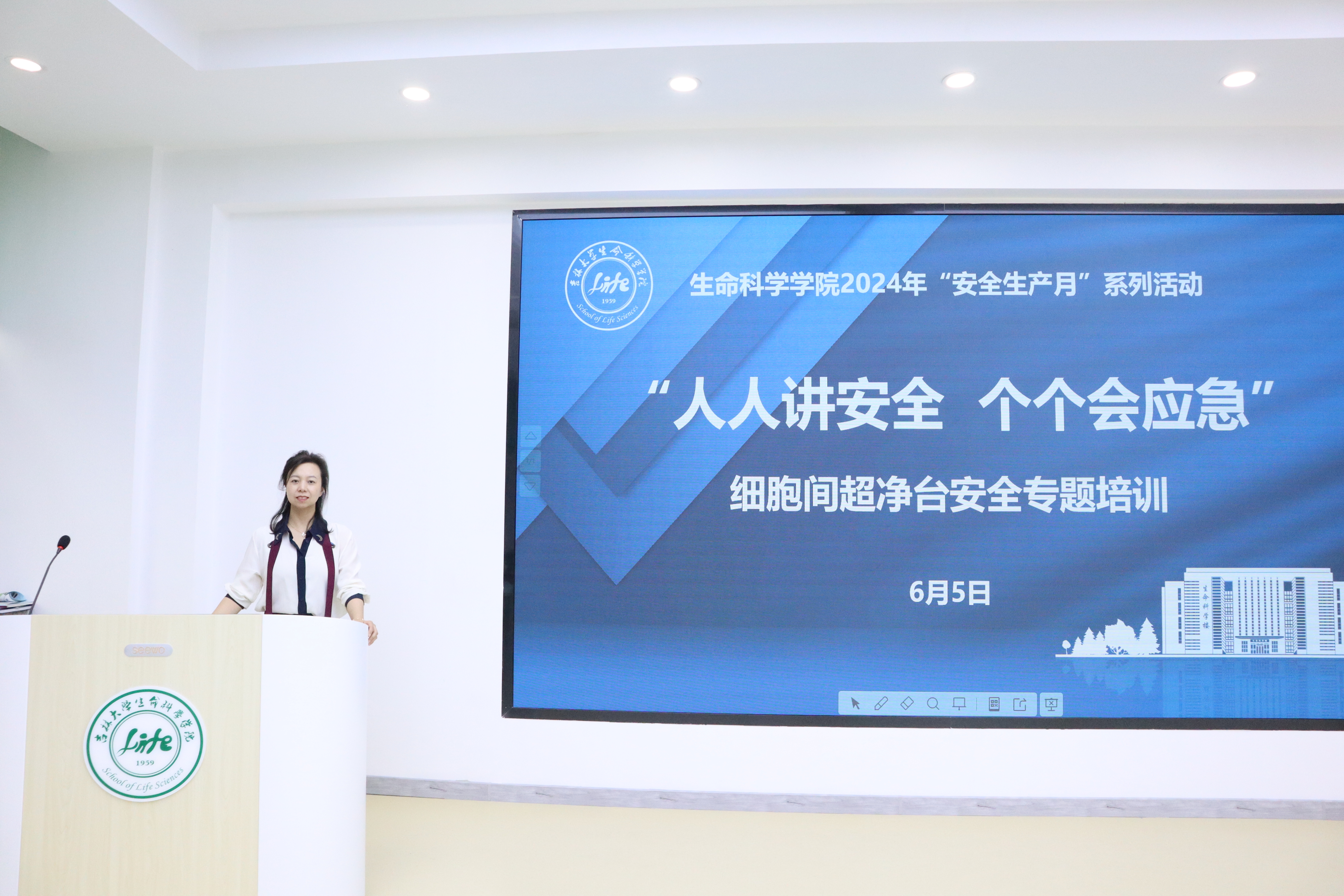举办2024年“安全生产月”系列活动,邀请学校保卫处消防科董立明同志就细胞间超净台安全展开专题培训,会议由学院行政副院长郑琳主持。