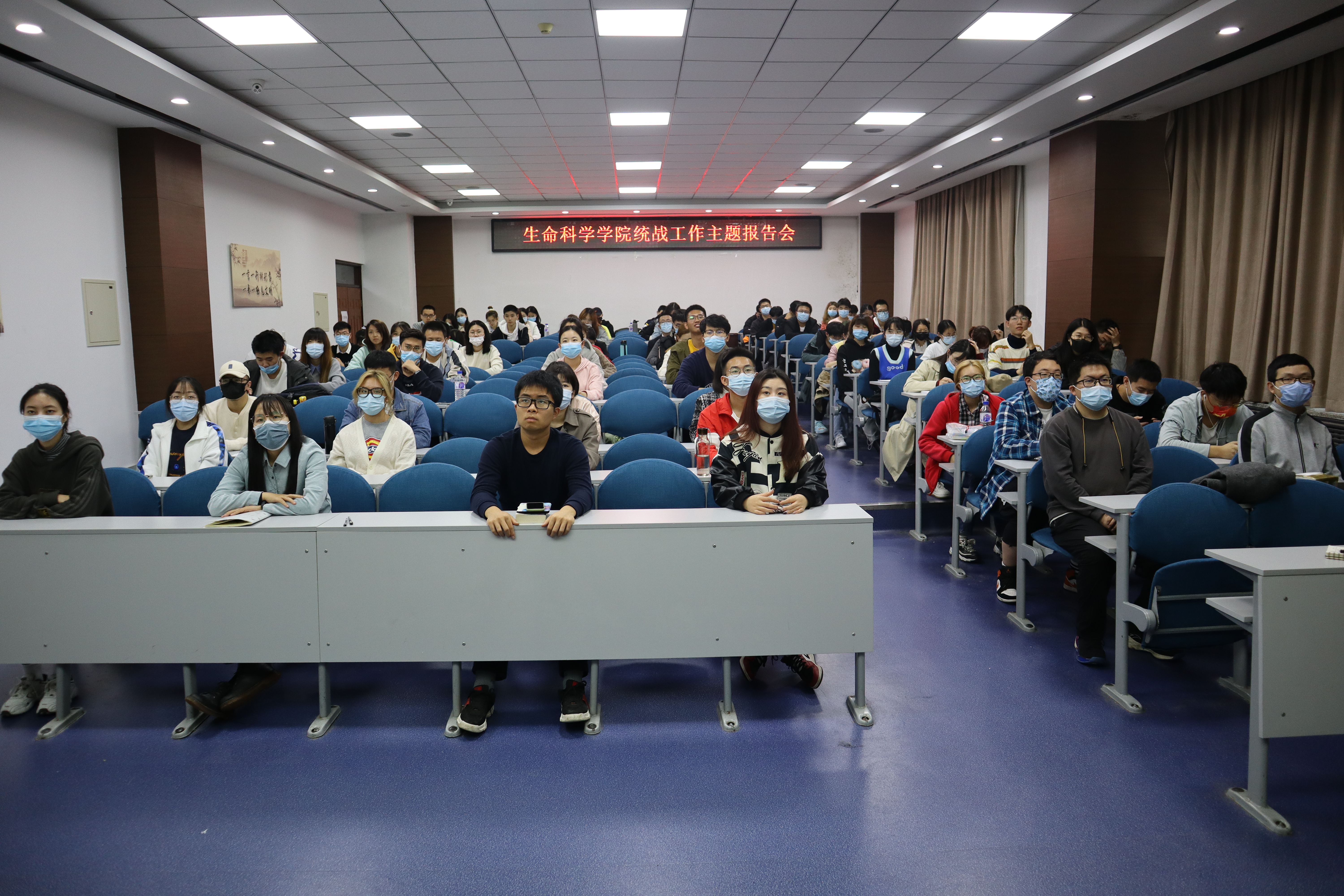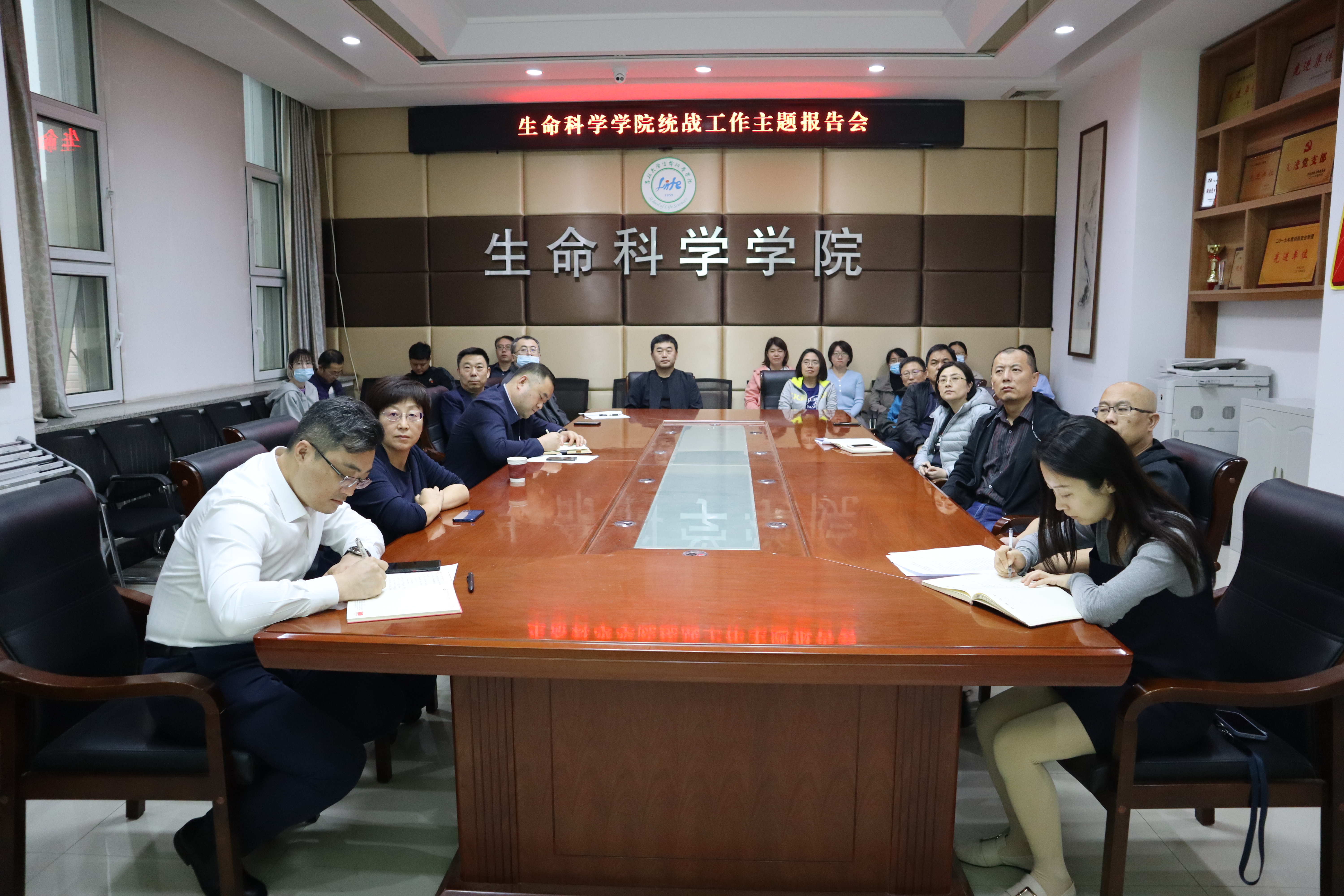 统战工作主题报告会于生命科学楼335会议室主会场、107会议室分会场及线上平台举行。活动邀请党委统战部副部长马忠正作题为《抓住重点,明确思路,推动统一战线工作开展》的主题报告。会议由学院党委书记白宇主持。
