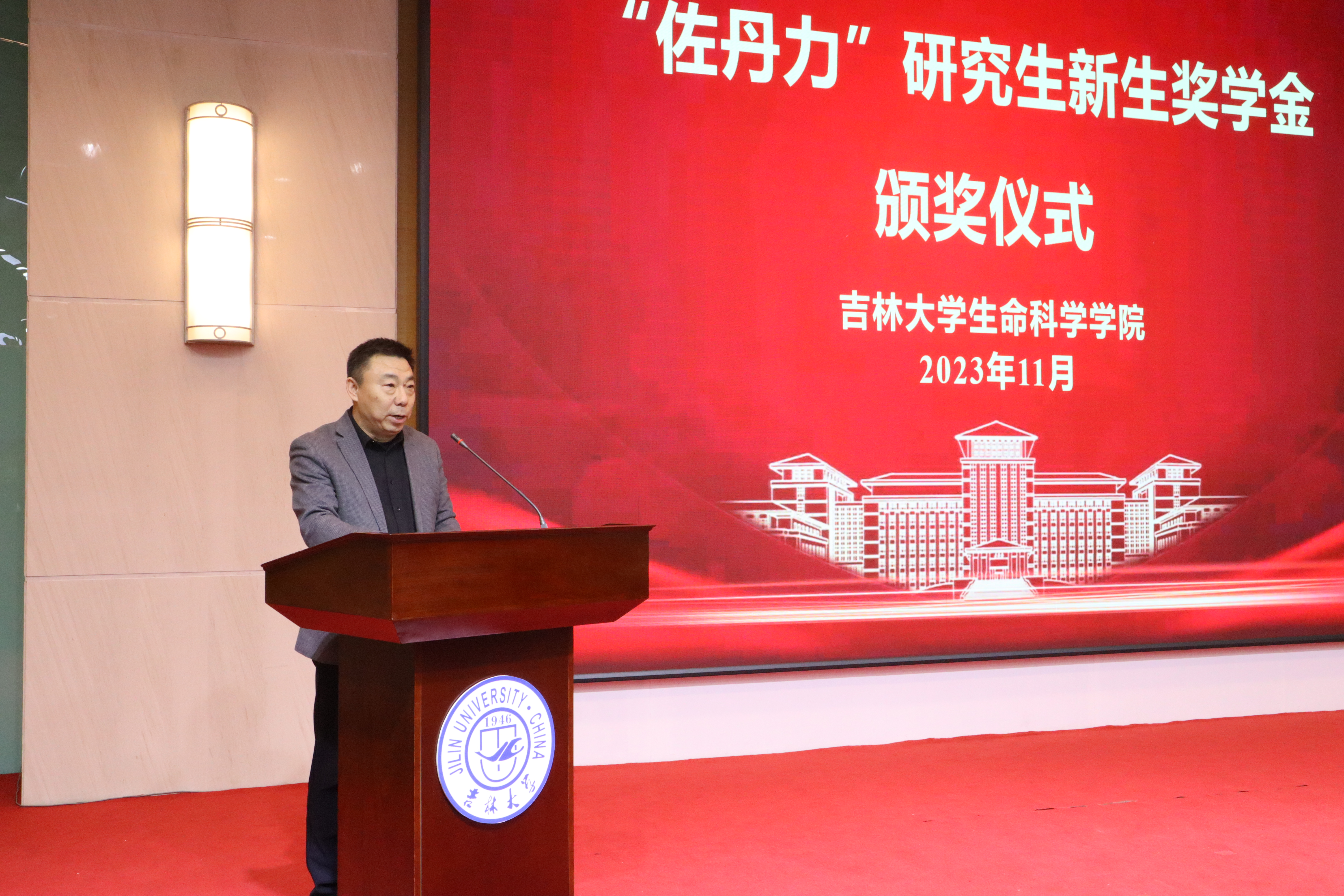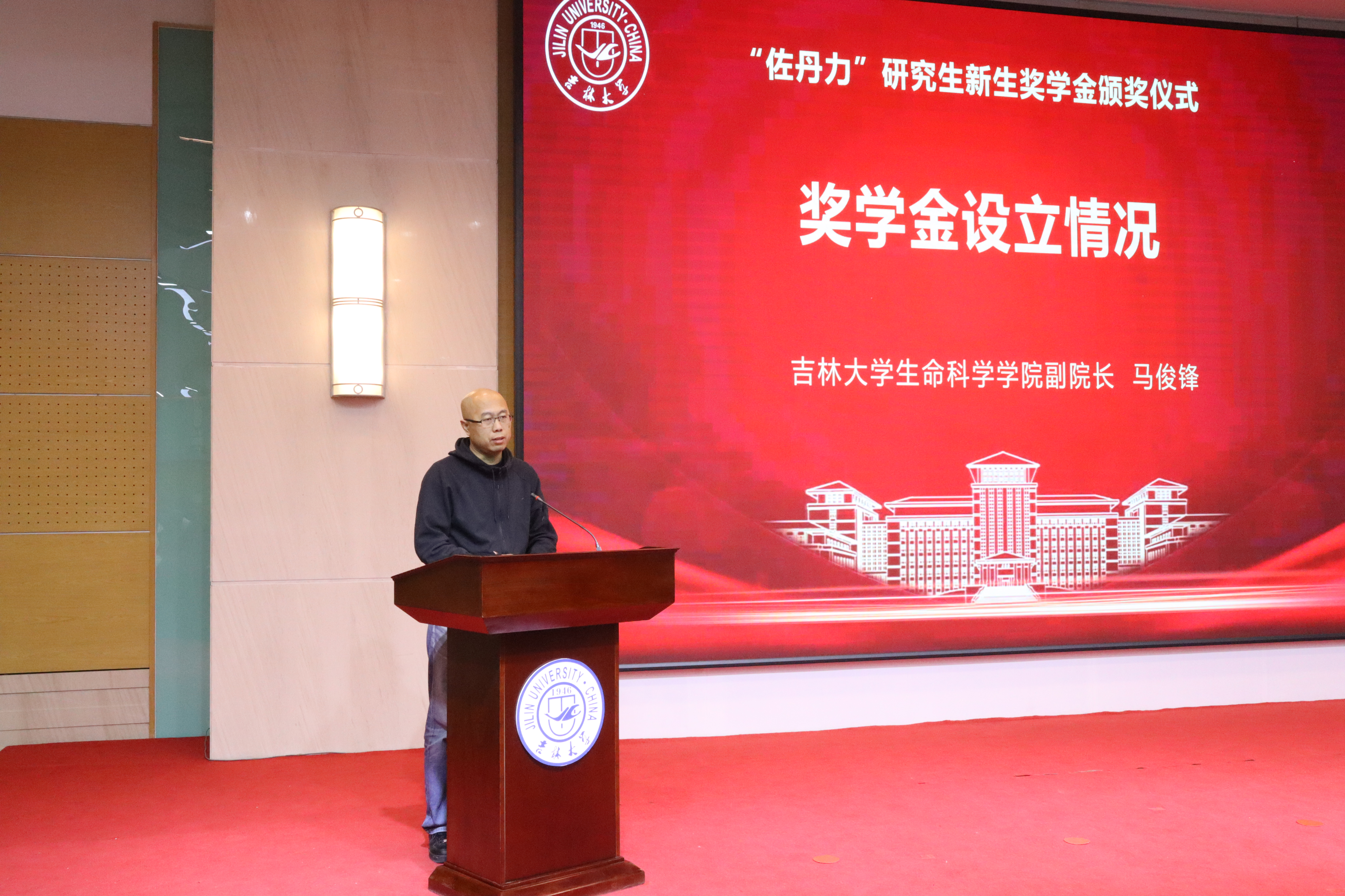 马俊锋介绍“佐丹力”研究生新生奖学金设立情况,本次奖学金共计发放78万元,旨在让获奖新生持续迸发科研热情,努力成为建设伟大祖国、建设美丽家乡的有用之才、栋梁之才;感谢韩丹校友对学院的贡献和支持,学院将聚焦主责主业,以更加饱满的热情投入一流人才培养事业,以更加务实的作风答好“一流学科”建设的生科答卷。