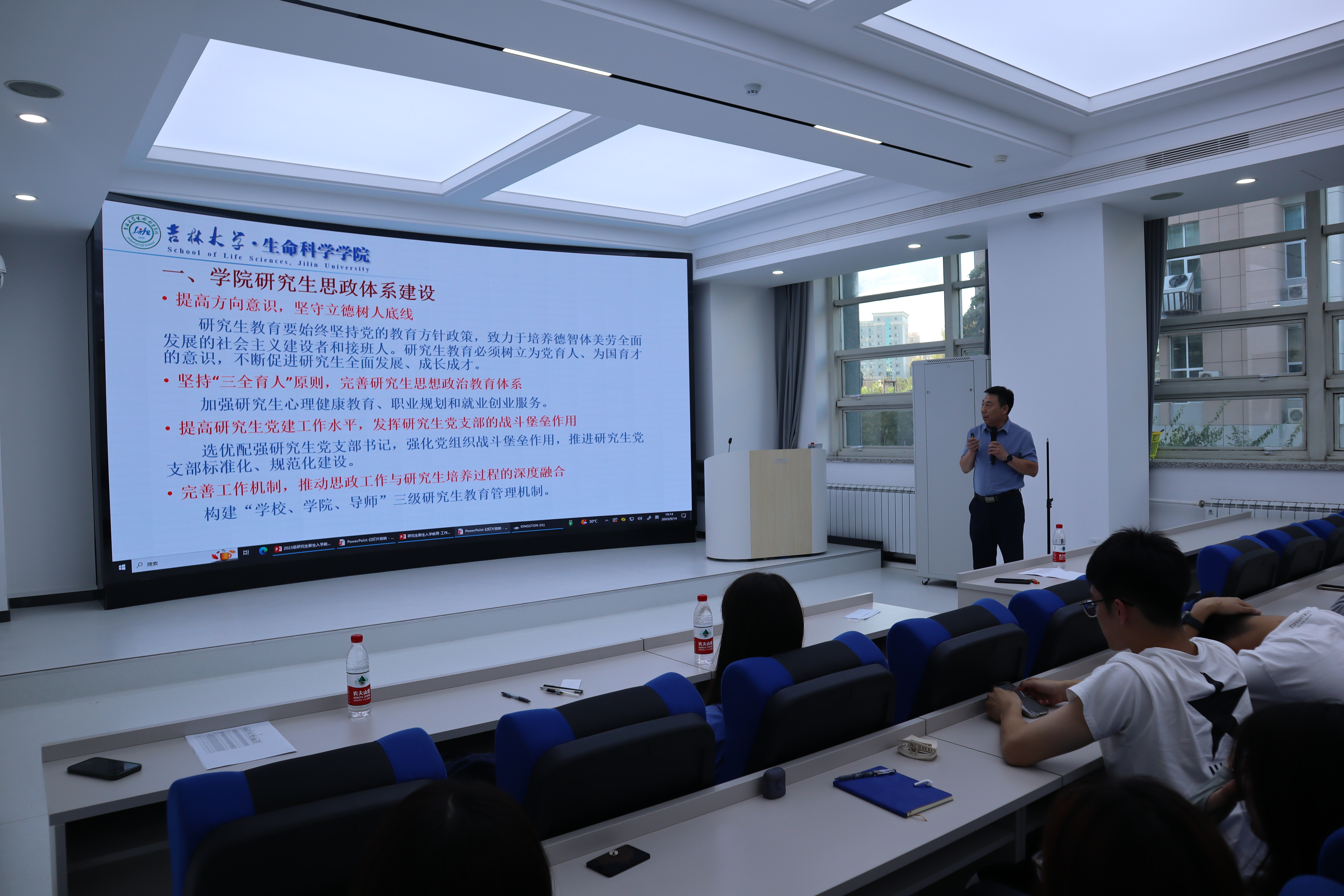 林相友围绕学院研究生思政体系建设、学院研究生教育概况、建立良好导学关系以及如何做好科研工作四个方面展开介绍,并结合具体数据让同学们对研究生培养制度和管理制度有了更加直观的了解。同时,他还对培养方案、课程考核方式、毕业答辩流程以及奖助学金评定等方面进行了全面细致的讲解。