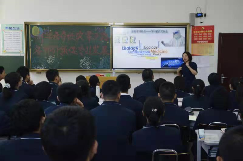 的内涵与优势。其次,崔银秋从学科交叉研究人类疾病入手,从多视角向学生们介绍了生物学现在的研究领域和发展前景,通过不同领域下生命科学的研究水平向大家证明了21世纪是生命科学的世纪。随后,陈妍介绍了学院的人才培养及特色,向同学们展示了学院的一流教学团队和支撑条件,通过介绍学院综合全面的科研训练体系,提高高中生对生物的兴趣。最后由侯阿澧向同学们介绍学院主要创新培养模式,从iGEM和BIOMOD两大国际竞赛入手,从竞赛流程到团队精神,详细向同学们介绍了学院参与两大竞赛的优秀成果。宣讲结束后,陈妍针对学院招生和毕业发展与在场同学进行交流讨论,陈老师从专业选择到人生规划,从生活学习到职业规划,为同学们答疑解惑,让他们对高中学习目标有了更深入的认知和规划。