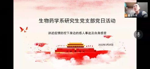 生物药学系研究生党支部党日活动由党支部书记林凤主持,支部全体党员参加。首先副书记张永锋领学了习近平总书记关于新冠肺炎疫情防控的重要讲话;接着与会党员分享了疫情防控期间身边发生的感人事迹和自己的感受;最后林凤总结道:面对3月长春市的新冠疫情,学校全力以赴地守护每一位学生的安全,大家也要做好防护措施,积极配合学校、学院的相关政策,共同阻断疫情传播链条;合理安排好学习和生活,把时间和精力放在有意义的事上;同时,作为学生党员,要积极投身到疫情防控工作中,争做志愿者,共同织密疫情防控网络,形成打赢疫情防控阻击战的强大合力。