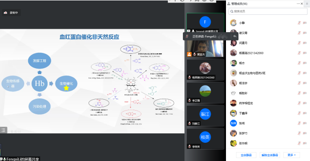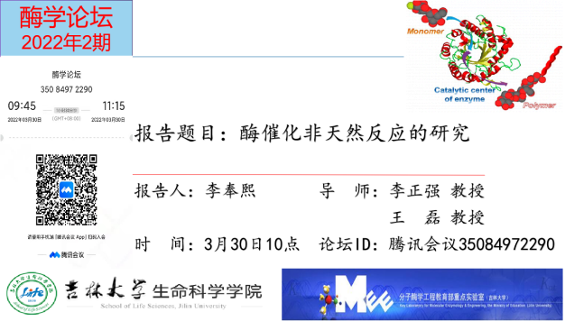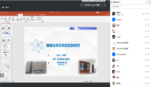 积极抗疫不停学,酶学论坛线上启,助力生物“双一流”,师生同心克时艰。2022年3月30日上午10点,第二期酶学论坛继续线上开展。2020级博士研究生李奉熙同学做关于“酶催化非天然反应的研究”的汇报,近100名师生参与了本次线上论坛。