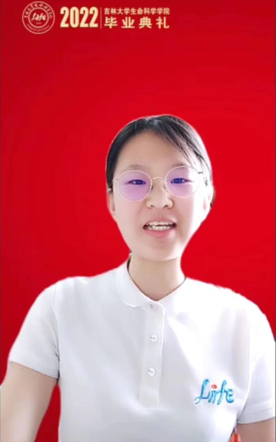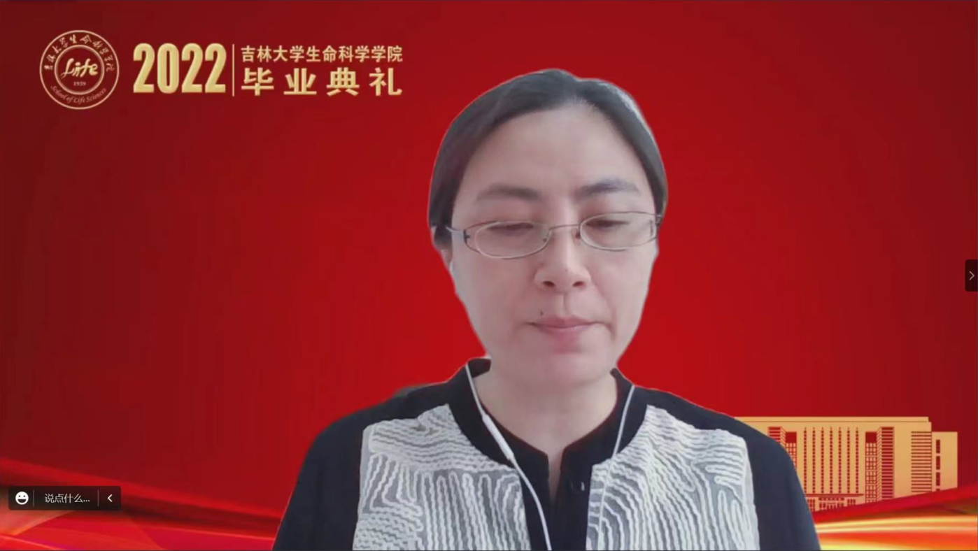 随后,2022届毕业本科生代表冷思宇同学发言,感情真挚诚恳饱含对学院的感激和眷恋。她首先分享了在校期间的学习生活体会和成长成才的经历,并表示是学院老师们的坚守、付出和陪伴坚定了她投身生命科学研究的梦想。同时表明,作为新时代的青年,生逢盛世、肩负重任,定会不忘初心、砥砺前行,跑出当代生科学子的最好成绩。最后,向学院、老师和全体毕业生献上真挚的祝福。