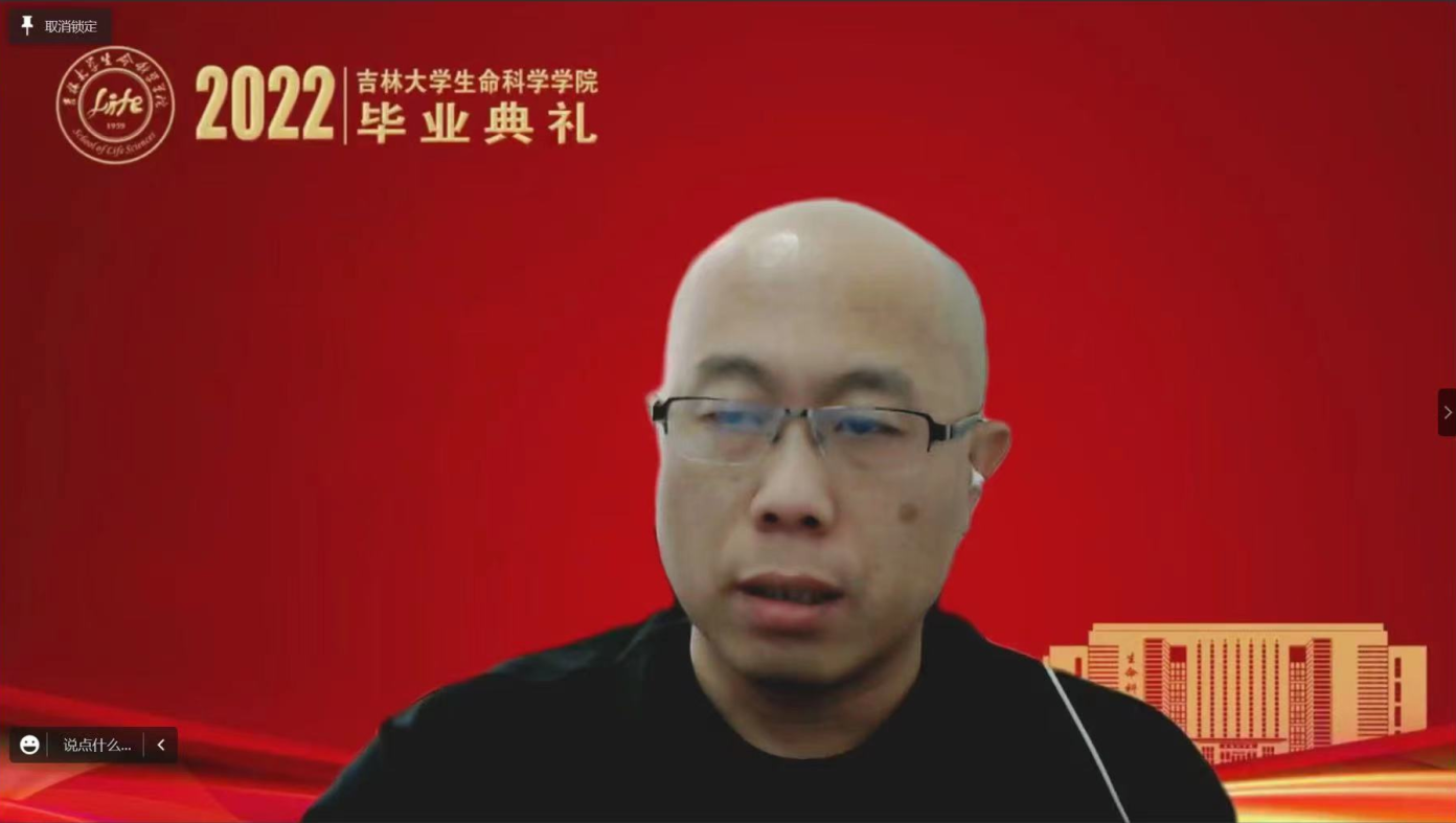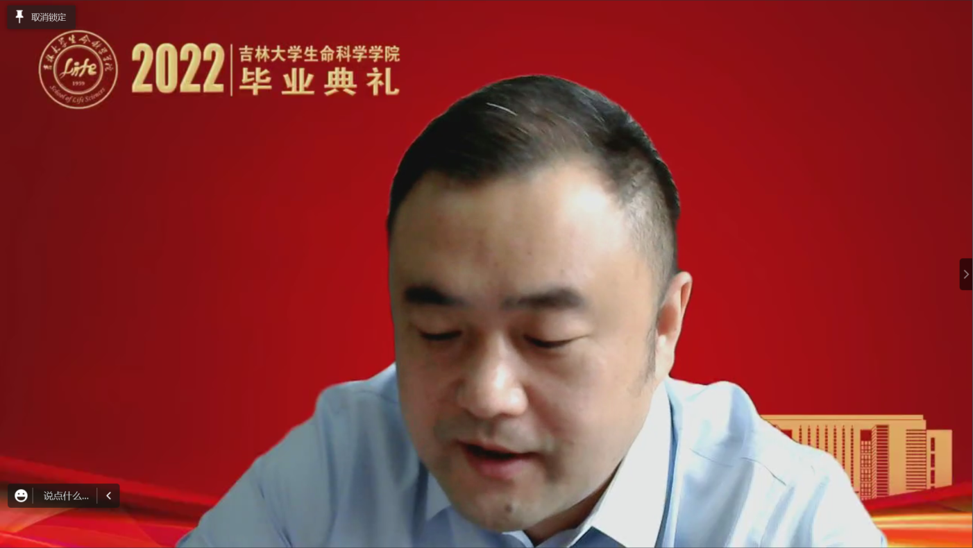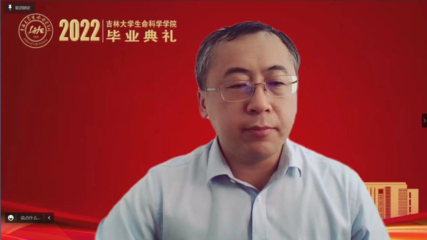院长于湘晖在毕业寄语中,首先带领师生回顾了几年来学院飞速发展的骄人成绩,并对广大毕业生提出四点希望:一是要赓续使命,以实际行动践行榜样精神。在习近平总书记对黄大年同志先进事迹作出重要指示五周年之际,作为生命科学领域的科研攻坚者,要弘扬和践行黄大年精神,将个人的成长成才融入到国家科技强国对于人才的迫切需求之中。二是要矢志不移,在青春的赛道上跑出好成绩。在中国全面实施创新驱动发展战略和健康中国战略的今天,要有咬定青山不放松的韧性,坐得住冷板凳,吃得下冷餐饭,发展成为基础研究拔尖创新人才,发展成为面向社会需求的复合型人才。三是要学以养德,坚守历久弥新的文明耐力。要明辨道德判断,以敏锐的道德判断在成长发展的轨迹上守住人生的底线;要涵养道德自觉,以根植于内心的道德自觉做一个对社会有意义、有贡献的人,一个散发光芒和力量的人;要笃定道德坚守,以高尚的道德坚守实现人生价值的升华。四是要脚踏实地,传承生生不息的生科血脉。要始终坚持“四个面向”,把握科技创新大势,深耕优势领域,做扎根中国大地、奋战科研一线的卓越生物学人才,在民族复兴的伟大事业中,在实现个人远大理想抱负中,大显身手、大有作为,以骄人的成绩伴随母院共赴辉煌!