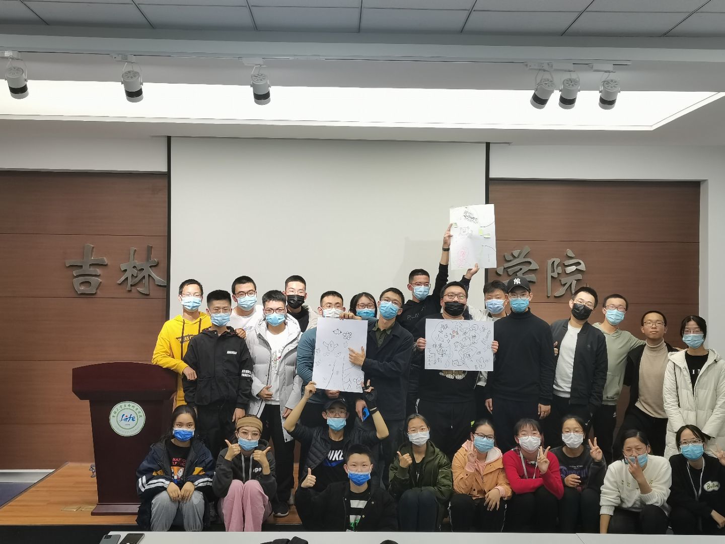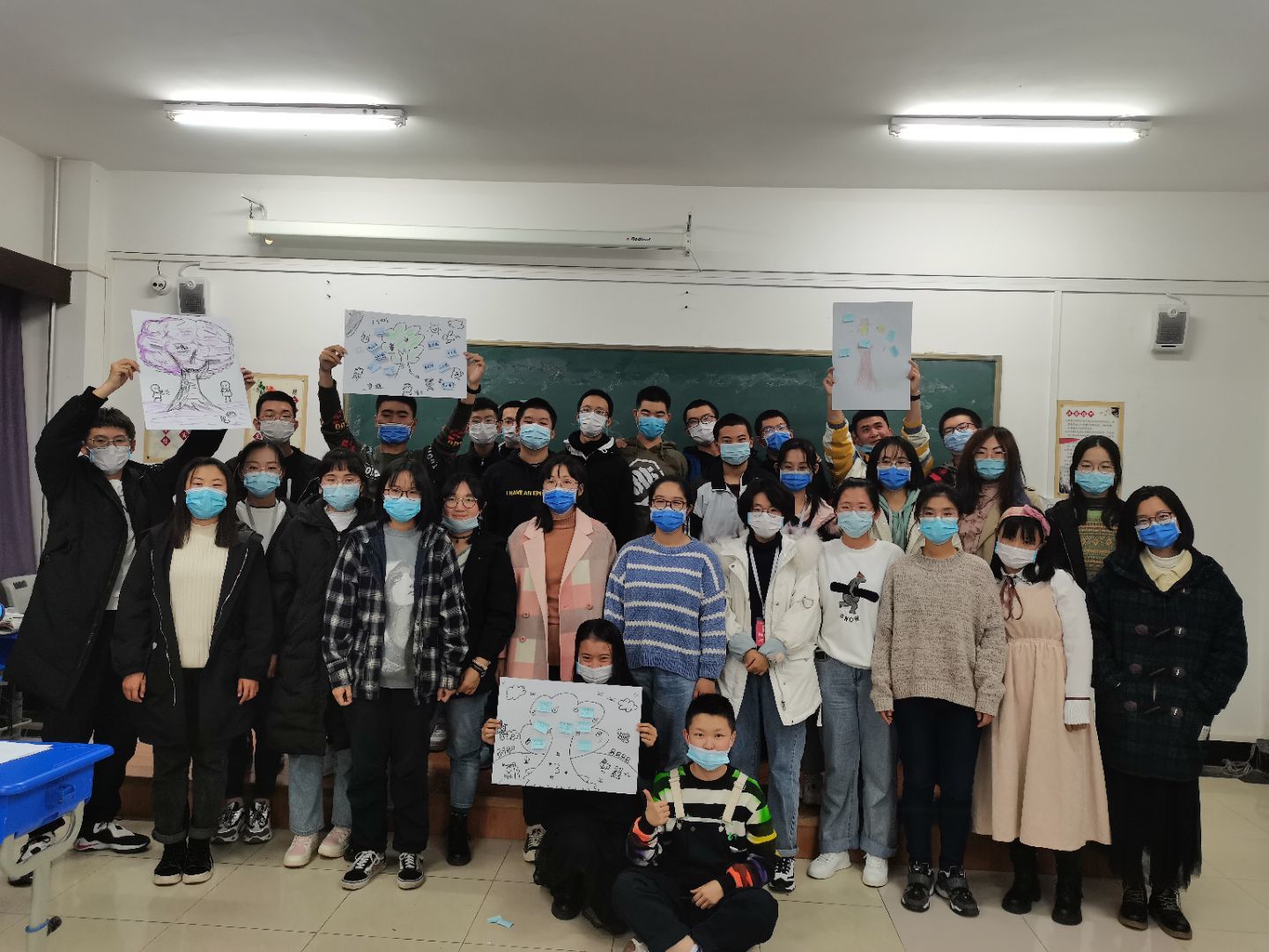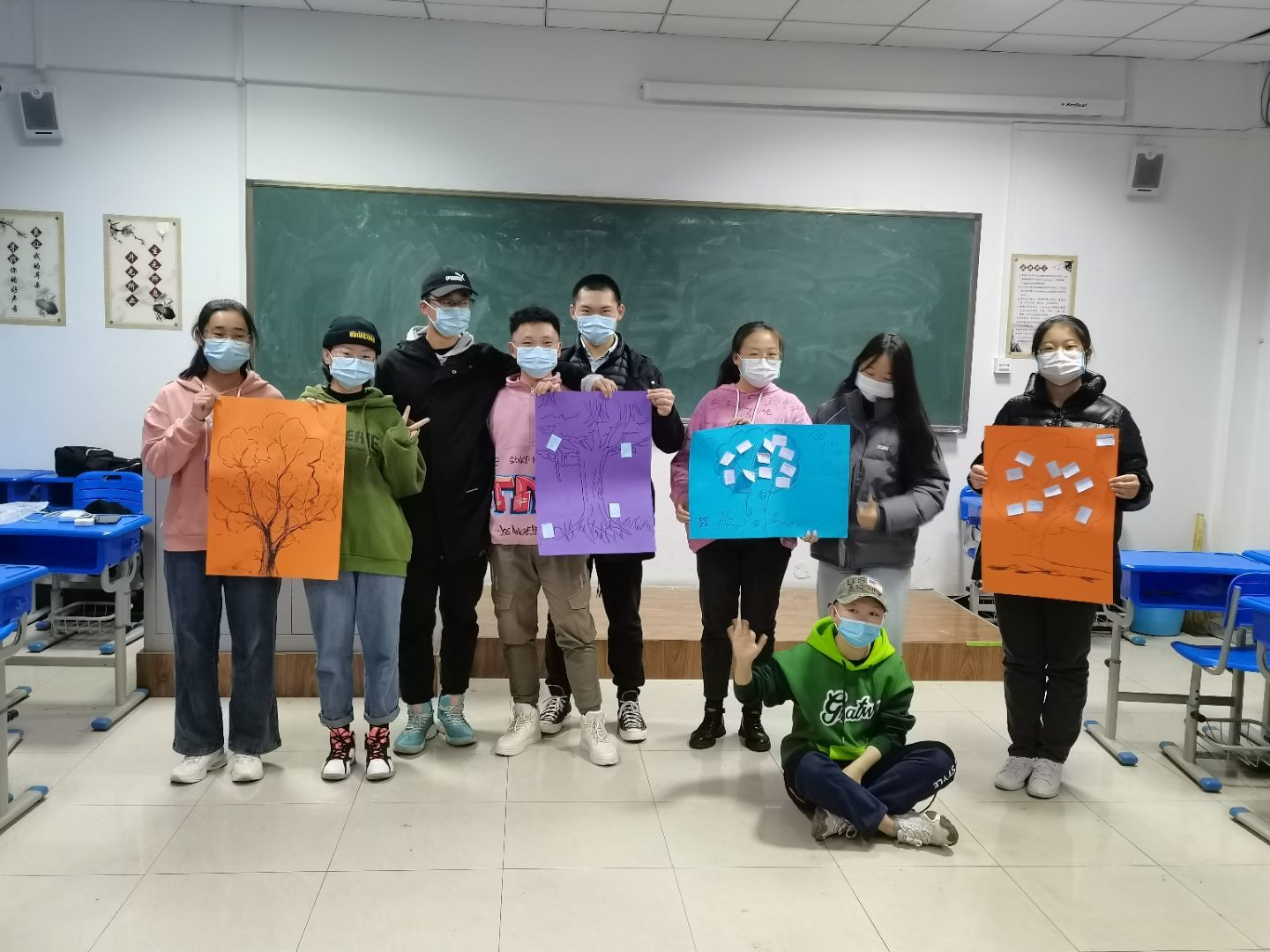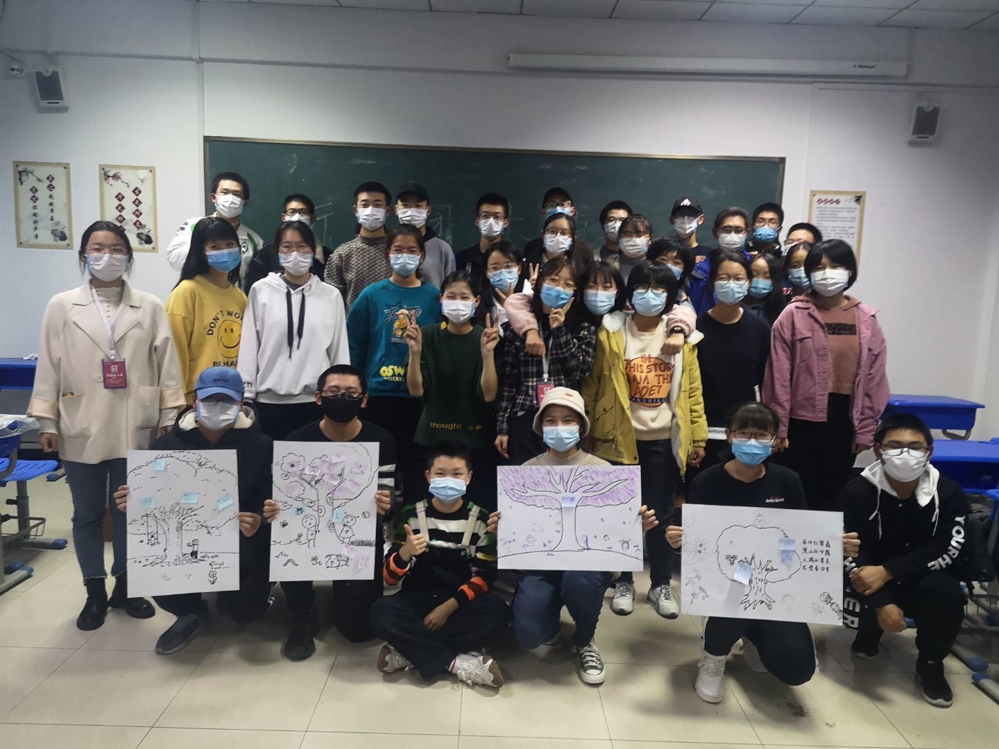 最后,活动在团体树的绘制中落下帷幕,绘制后每个小组推选一人上台为大家展示并讲解画作,在讲解中,讲解员与团队成员心意相通,有了更深层次的思想交流。至此,心理班会圆满成功。
