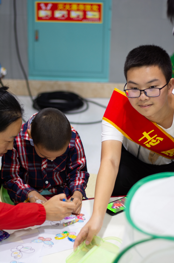 面对各种颜色、大小不一的蝴蝶标本,小朋友们睁大了眼睛仔细观察,争先恐后的去问志愿者大哥哥,这个是什么蝴蝶,那个又是什么蝴蝶,志愿者们耐心的一一进行讲解。有一些小朋友甚至激动地用手拍展示台的玻璃,也有一些小朋友关注活体蝴蝶,持续地晃动着网笼,场面充满欢声笑语。