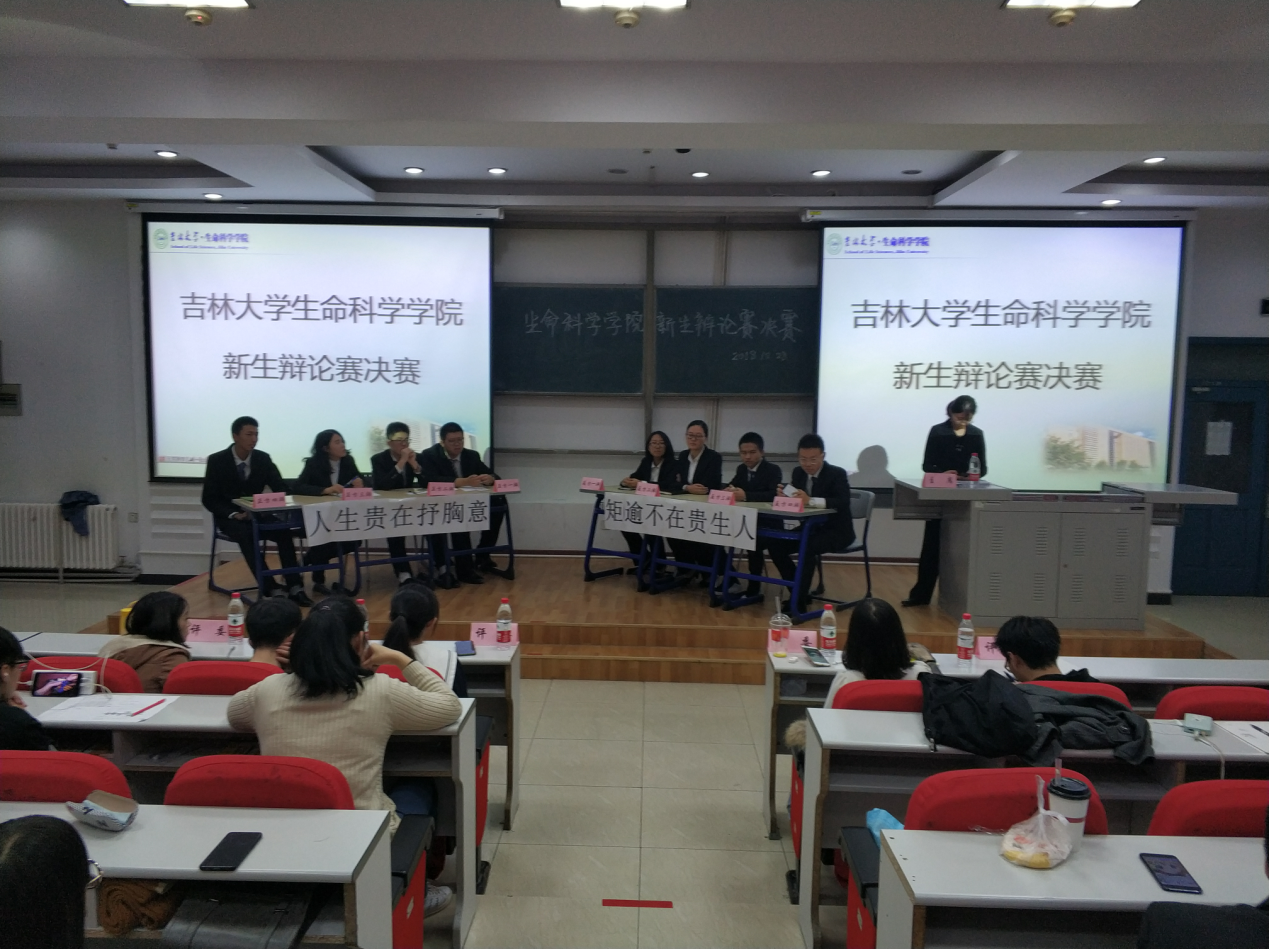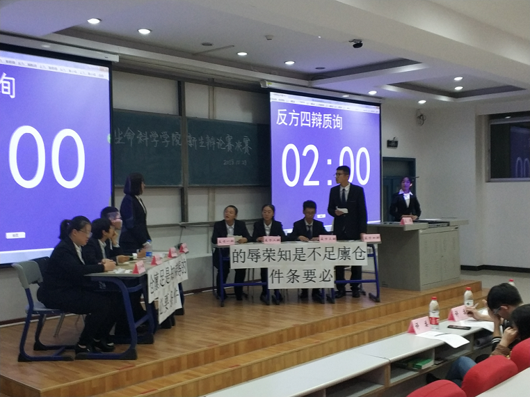 为锻炼学生的思维逻辑和语言表达能力,培养团队协作能力,形成勤于思考、敢于思辨、善于思辨、积极探索的良好氛围,生命科学学院开展了为期一个月的新生杯辩论赛。10月28号晚上六点,辩论赛决赛在经信教学楼第三阶梯教室举行。进入决赛的班级有2018级八班,2018级二班,2018级三班和2018级四班。决赛由2015级张诗音、黄振轩,2016级刘乃彰、董泳辰、李鑫担任评委。