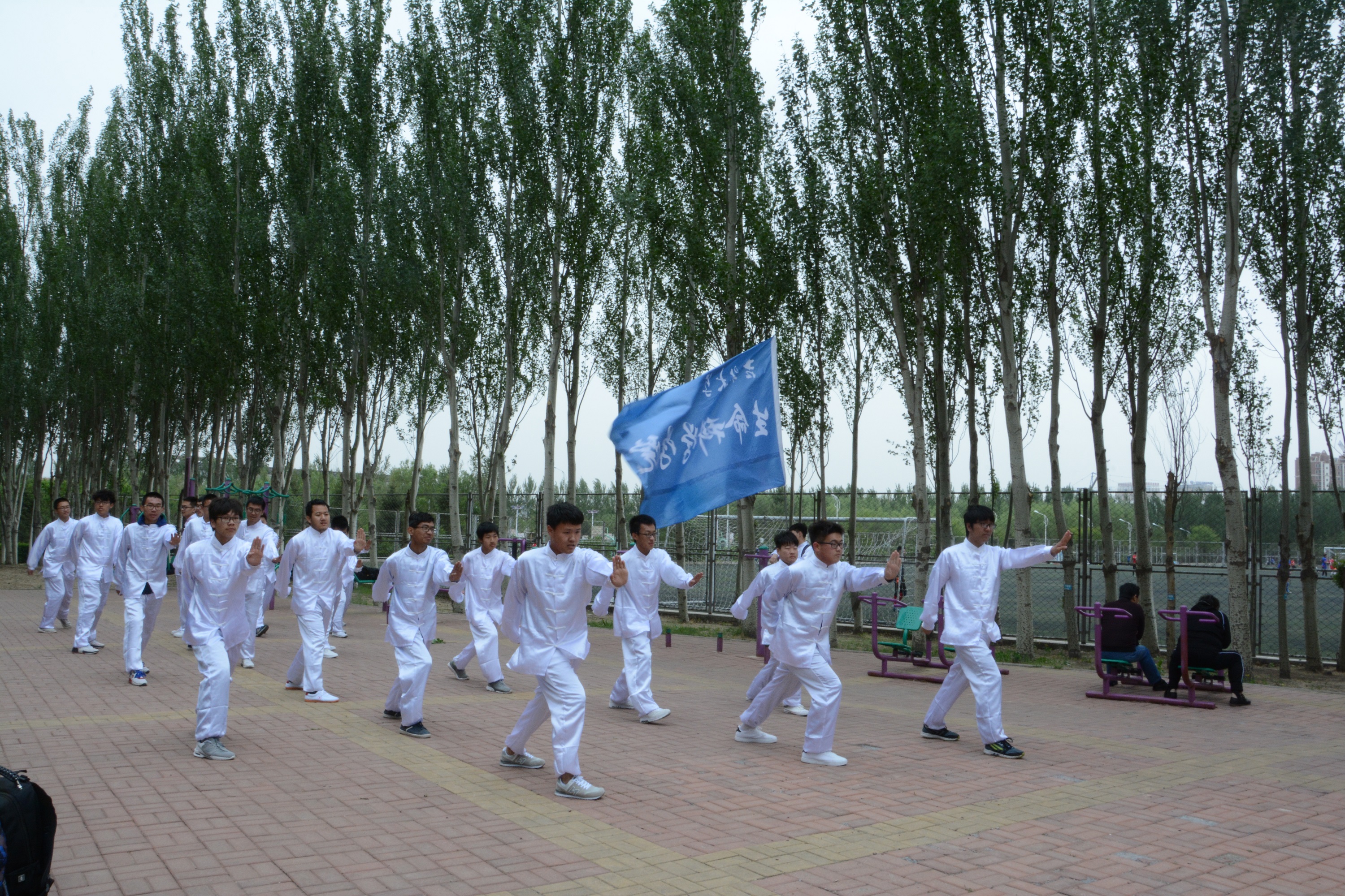 第五十七届田径运动会“三路长拳”比赛。学院选拔30名男同学组成长拳队伍,由高年级学生全程组织和指导训练。