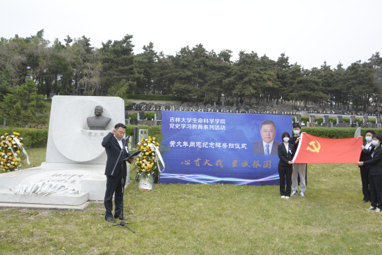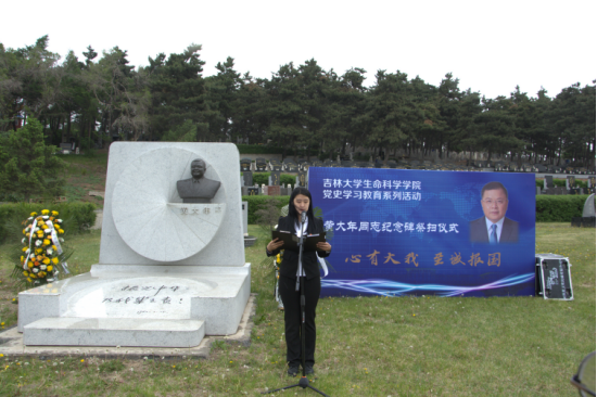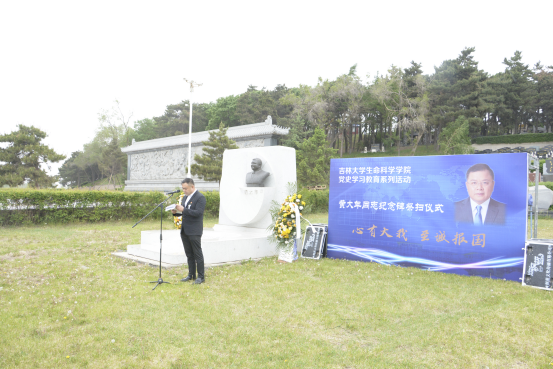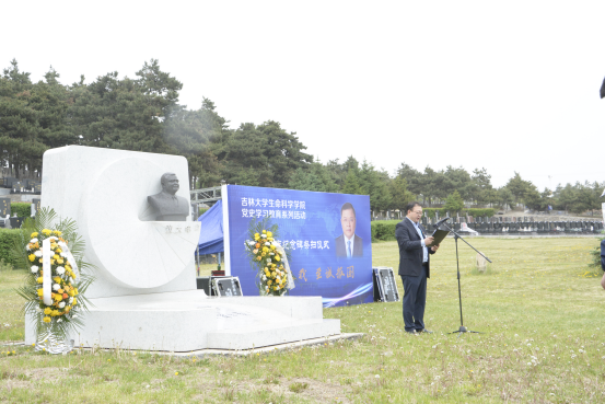 学院微生物学与免疫学系教工党支部书记单亚明代表教师发言 ,他说道“祭扫黄大年同志纪念碑,站在‘两个一百年’奋斗目标的历史交汇点上,作为党员,我们应当继续传承发扬黄大年老师心有大我、至诚报国的爱国情怀。教书育人、敢为人先的敬业精神,淡泊名利、甘于奉献的高尚情操。以‘只要祖国需要,我必全力以赴’的坚定勇气。迎接‘双一流建设’船到江心的关键期,应对祖国发展改革攻坚的发力期,勇担职责使命,不负时代重托。”