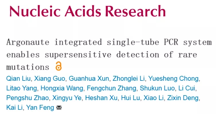 2021年4月27日,在线发表了上海交通大学生命科学技术学院冯雁教授团队在Nucleic Acids Research发表了文章Argonaute integrated single-tube PCR system enables supersensitive detection of rare mutations。研究人员提出了一种新型“A-Star” 低丰度SNV核酸富集技术,通过发现Argonaute核酸酶对单碱基突变(SNV)靶标序列精准识别的规律,发展了“一管式”PCR多重核酸富集和检测的A-Star (Ago-Directed Specific Target Enrichment and Detection) 新策略,实现血液等样本中低丰度突变基因的高效、多重富集和检测。