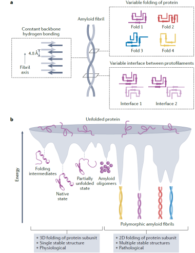 作者进一步探讨了蛋白纤维聚集体的结构多态性的产生机制。天然的蛋白折叠通常形成三维的立体构象,然而在形成淀粉样纤维时,每个蛋白质单体通常形成富含β折叠且在同一平面展开的二维构象。与此同时,蛋白单体分子层之间通过β折叠之间的分子间氢键网络沿纤维轴向重复堆叠形成超分子复合体。与蛋白天然构象的三维折叠相比,纤维聚集体的二维折叠缺少更严格的分子内限制,导致同一蛋白单体能够形成多个能量相似的拓扑结构(图1),从而组装形成具有多种不同构象的蛋白纤维聚集体。不同纤维结构之间的差异主要包括蛋白单体内β折叠的排列不同,以及原纤维间的相互作用界面不同(图1)。