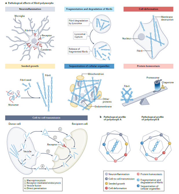 作者在综述中首先提出蛋白病理纤维聚集体的两个关键结构特征:同构性(isomorphism)和多态性(polymorphism)。对纤维同构性的了解有助于寻找神经退行性疾病发病机制的共性,开发广谱的药物。而纤维聚集结构的多态性则对于理解高度异质性的神经退行性疾病的发病机制至关重要。蛋白聚集结构多态性,是指同一种蛋白具有在不同病理条件下形成不同聚集结构与病理毒性的淀粉样纤维聚集体(即strains)的性质。针对神经退行性疾病患者脑组织来源及体外重组的病理纤维的大量研究结果显示,不同的蛋白纤维strains能够影响不同的细胞类型并在不同的脑区进行传播,对应临床表型的异质性。揭示不同strains的结构与相应疾病的对应关系将极大的推动神经退行性疾病亚型的精准分类和分子诊疗的发展。