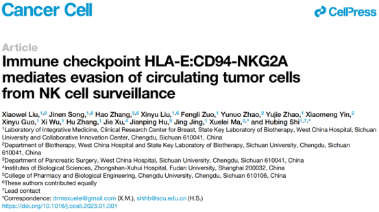 校友、四川大学华西医院生物治疗国家重点实验室石虎兵教授团队在顶级期刊Cancer Cell(IF:38.585)上以封面文章形式发表了题目为Immune checkpoint HLA-E:CD94-NKG2A mediates evasion of circulating tumor cells from NK cell surveillance的研究论文。该研究发现了CTCs与NK细胞间新的免疫检查点分子对HLA-E:CD94-NKG2A,阐明了CTCs逃避宿主免疫监视的新机制,进而提出靶向免疫检查点HLA-E:CD94-NKG2A抑制肿瘤转移的治疗策略。
